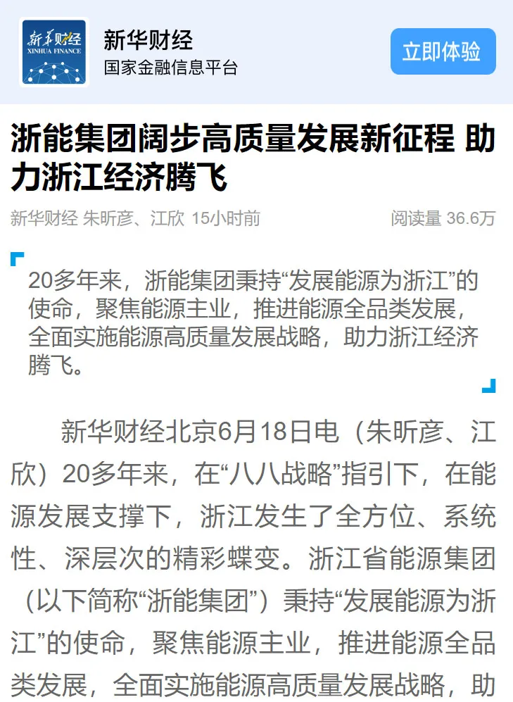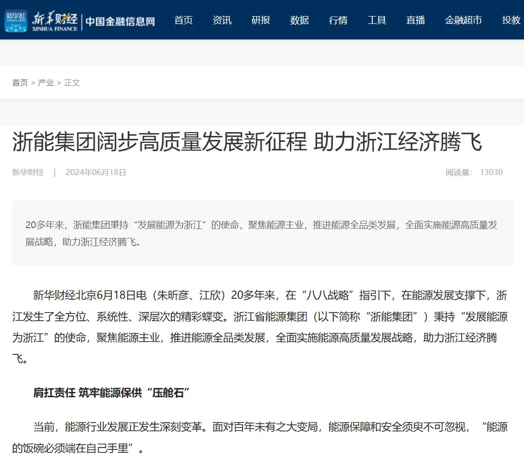 6月18日,新華社“新華財經(jīng)”客戶端報道《浙能集團(tuán)闊步高質(zhì)量發(fā)展新征程 助力浙江經(jīng)濟(jì)騰飛》。