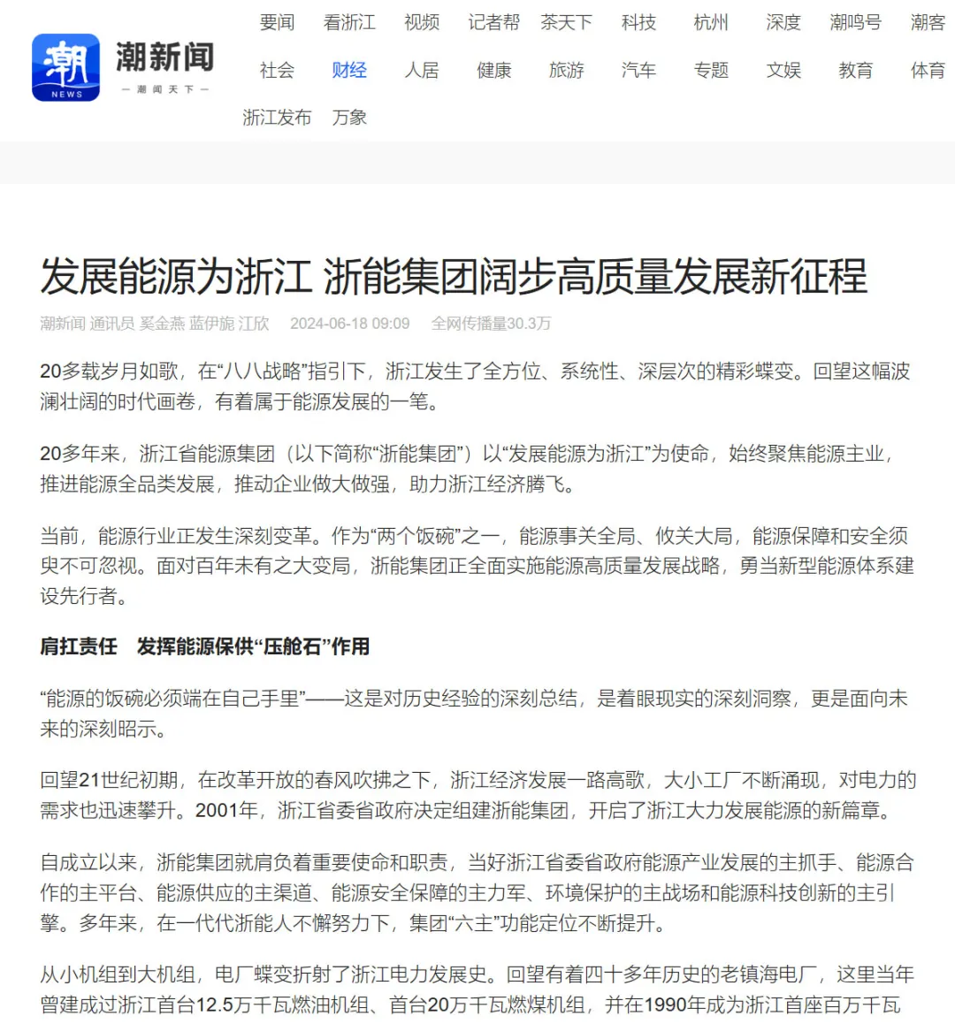 6月18日,“潮新聞”客戶端報道《發(fā)展能源為浙江 浙能集團(tuán)闊步高質(zhì)量發(fā)展新征程》。