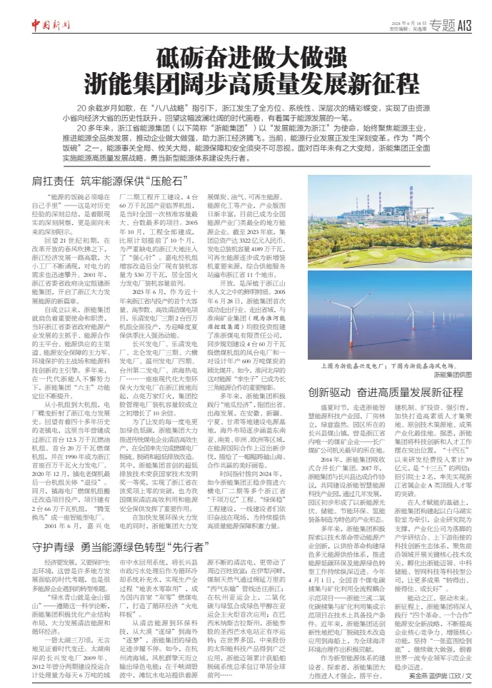 6月18日,中新社《中國新聞》報刊發(fā)《砥礪奮進(jìn)做大做強(qiáng) 浙能集團(tuán)闊步高質(zhì)量發(fā)展新征程》。