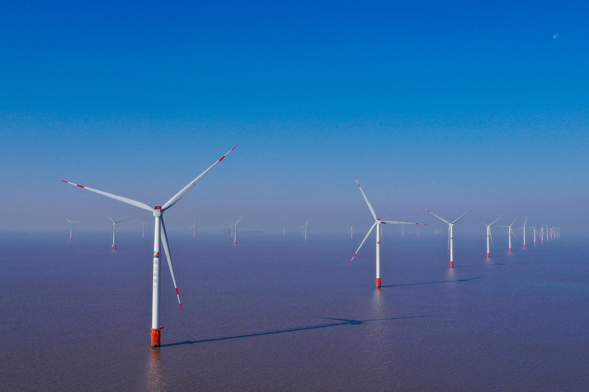 在杭州灣海域,風(fēng)機(jī)群擎天而立輸出綠色電能,圖為浙能嘉海風(fēng)電場。 張露 提供