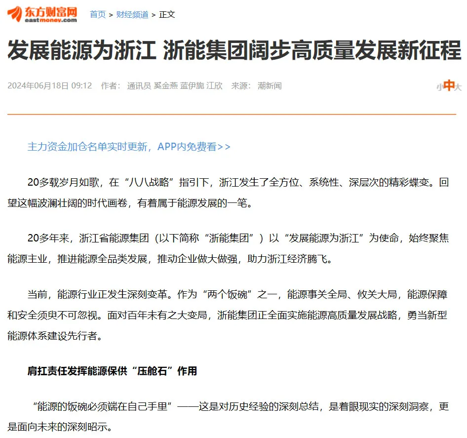 6月18日,東方財富網(wǎng)報道《發(fā)展能源為浙江 浙能集團(tuán)闊步高質(zhì)量發(fā)展新征程》。