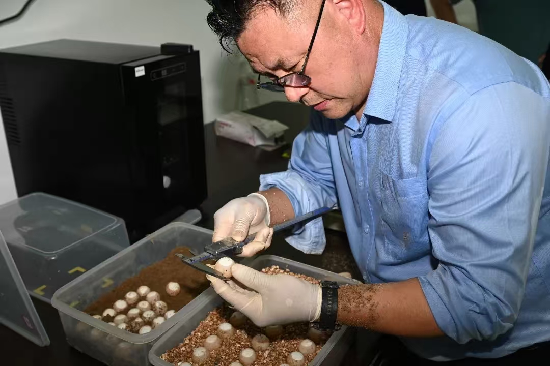 隨著表面黃褐色的沙土被撥開,在大約深30公分的位置,一枚枚雪白的黿卵也現出真容,葉承義用刷子輕輕掃開黿卵旁邊的泥土,小心翼翼將它們拿進塑料盒,帶回站內的控溫車間內進行測量、登記,以便孵化。