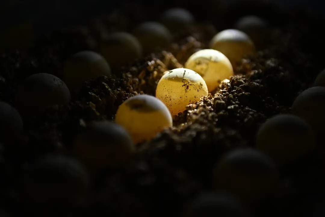 6月28日上午,在浙江青田浙能灘坑水電站水生生物增殖放流站,工作人員將母黿“貝貝”今年產的首批黿卵取回,共計48枚,其中有47枚受精,每枚平均重量約16克,直徑在3厘米左右。此次人工輔助繁育和保種工作,將有效提高黿卵孵化率,進一步助推野生黿種群資源恢復。