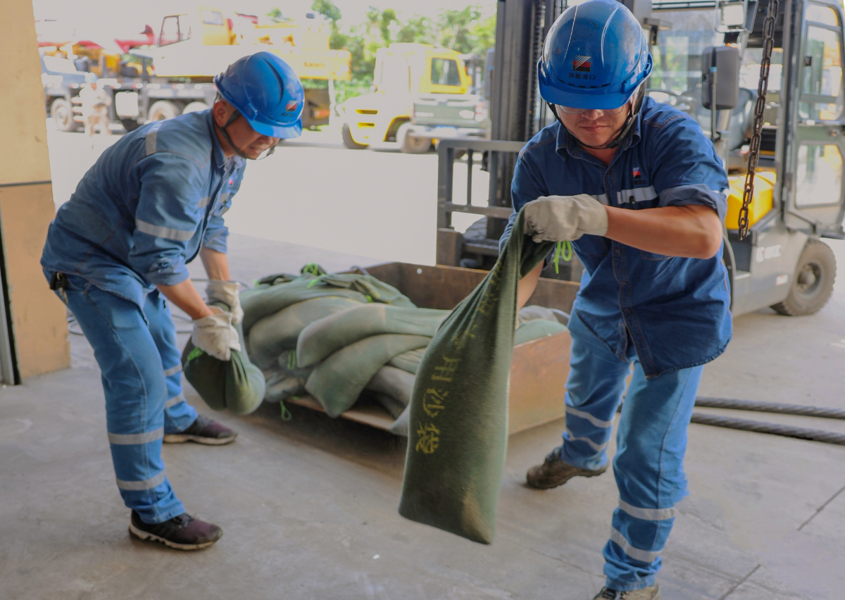 各單位提前備足各類防汛防臺專用物資,緊盯低洼區域、電子室等重點區域筑牢安全堤壩。圖為浙能港口流機班布設防汛沙袋。 錢威 攝