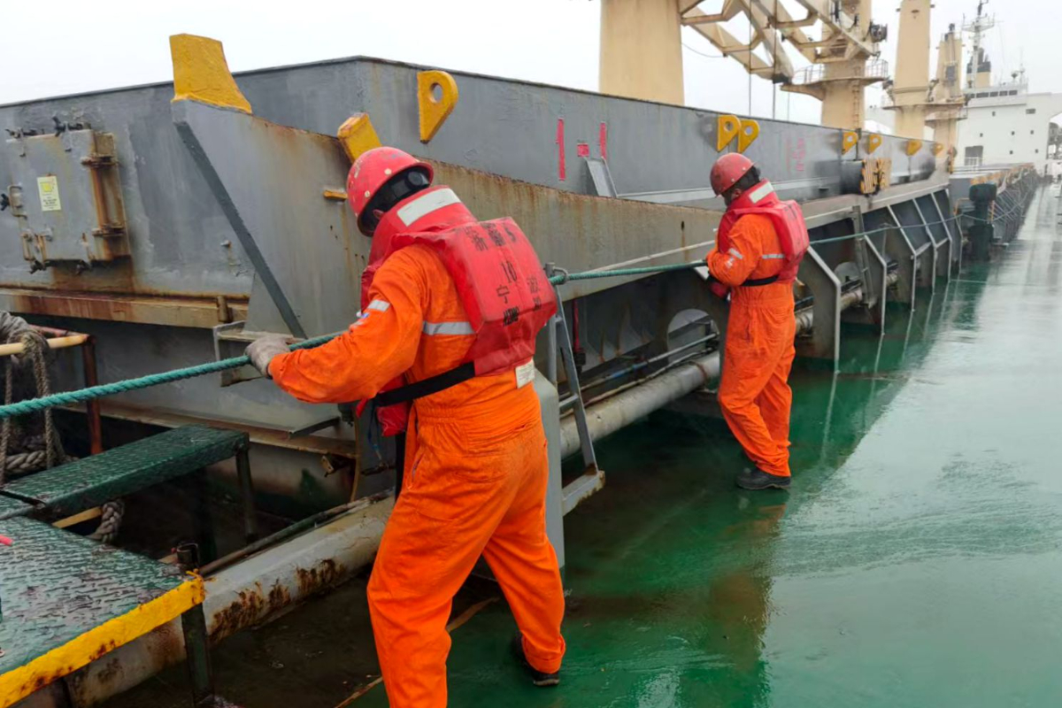 燃料供應運輸方面,各環節高效銜接、相關單位緊密協作,確保臺風影響期間電廠電煤安全存量。圖為寧波海運船員做好設備綁扎系固工作,確保臺風期間船舶安全。 陳健慧 攝