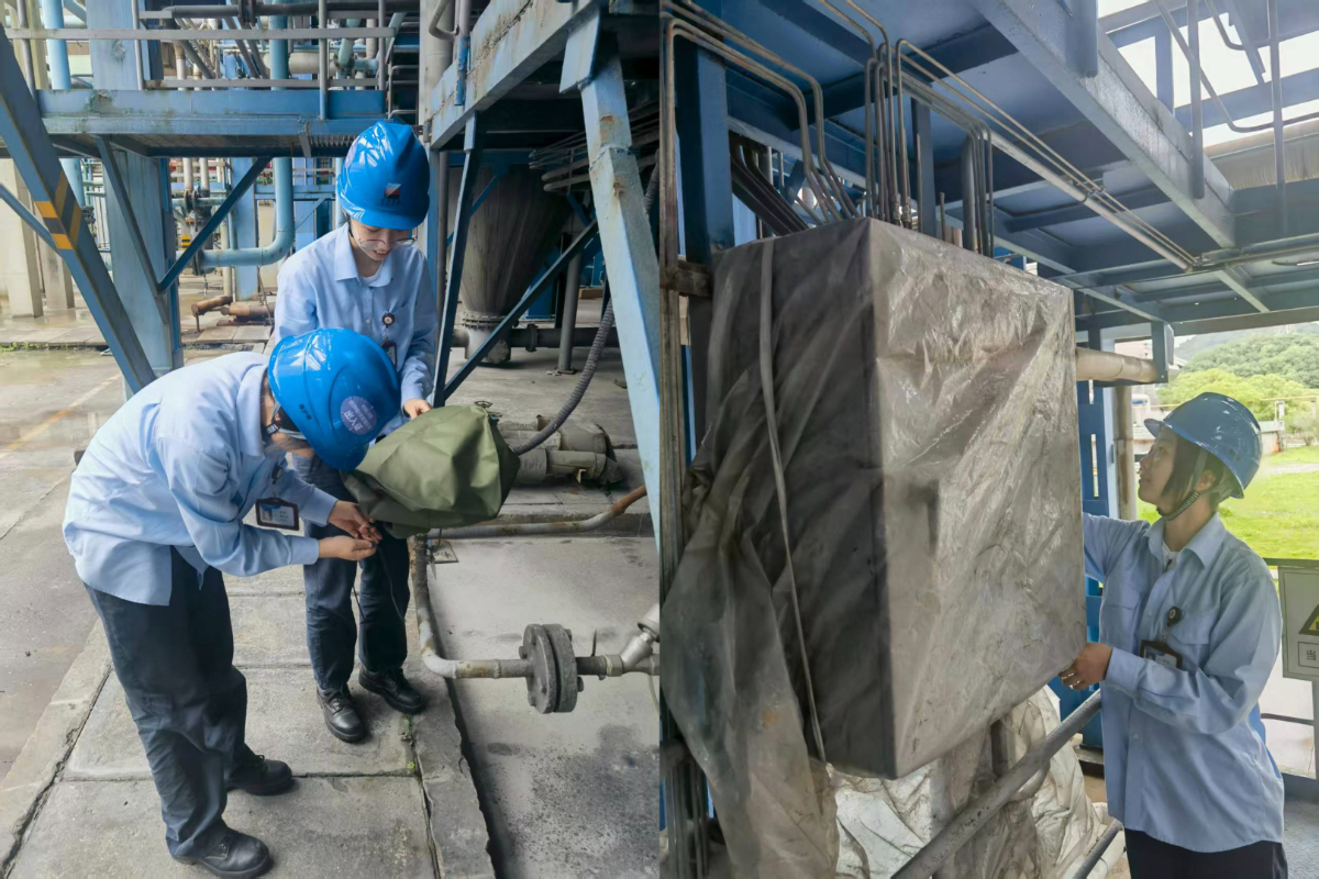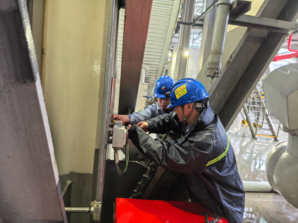 各單位以“橫向到邊、縱向到底”的標準迅速開展“拉網式”風險隱患排查。圖為臺州電廠維護人員檢查加固戶外設備防雨設施。 耿千舒 攝