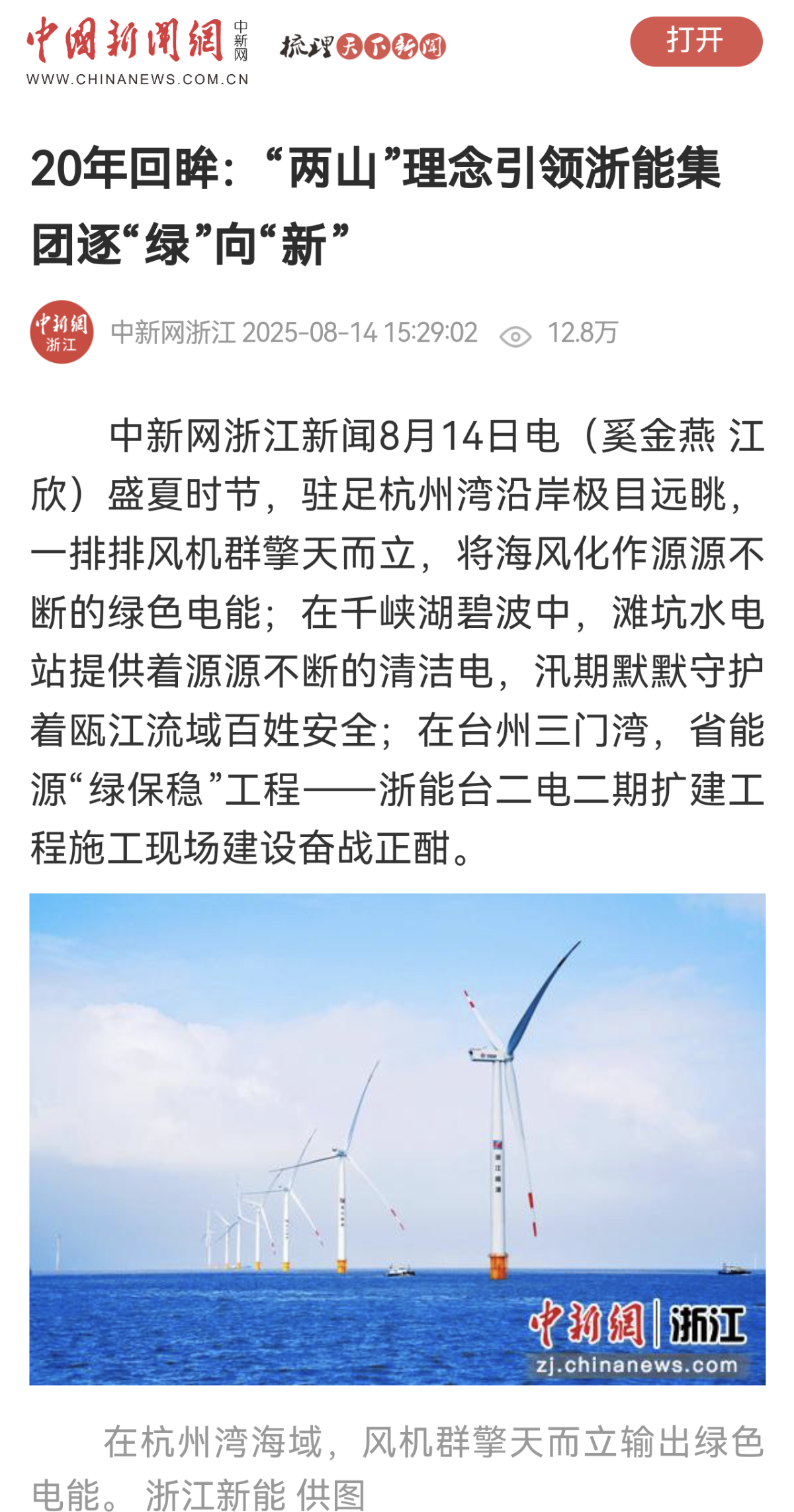 8月15日,中新社刊發《20年回眸:“兩山”理念引領浙能集團逐“綠”向“新”》。 中新社 提供