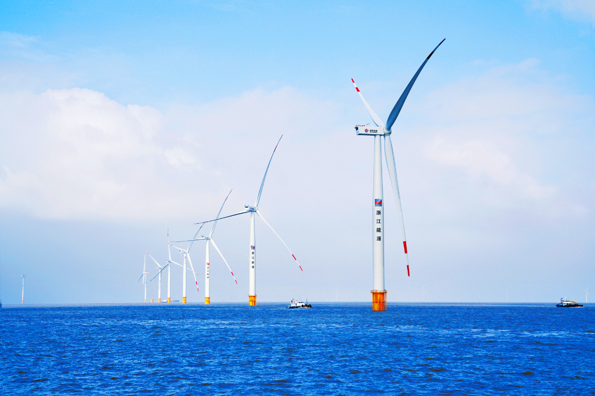 在杭州灣海域,風機群擎天而立輸出綠色電能。 浙江新能 提供
