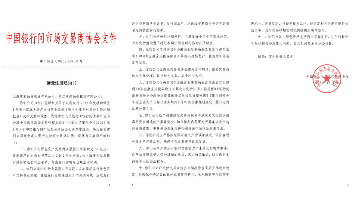 近日,浙能(璞能)融資租賃公司成功獲批浙江能源租賃2023年度璞融綠金1號第一期綠色定向資產支持商業票據(碳中和債/鄉村振興)項目,標志著浙江省內首例“碳中和債/鄉村振興”資產支持商業票據產品獲批。項目注冊金額30億,首期獲批金額6.21億,單期發行不超過180天(可滾動發行),也是全省首例雙主體注冊資產支持商業票據(ABCP)。