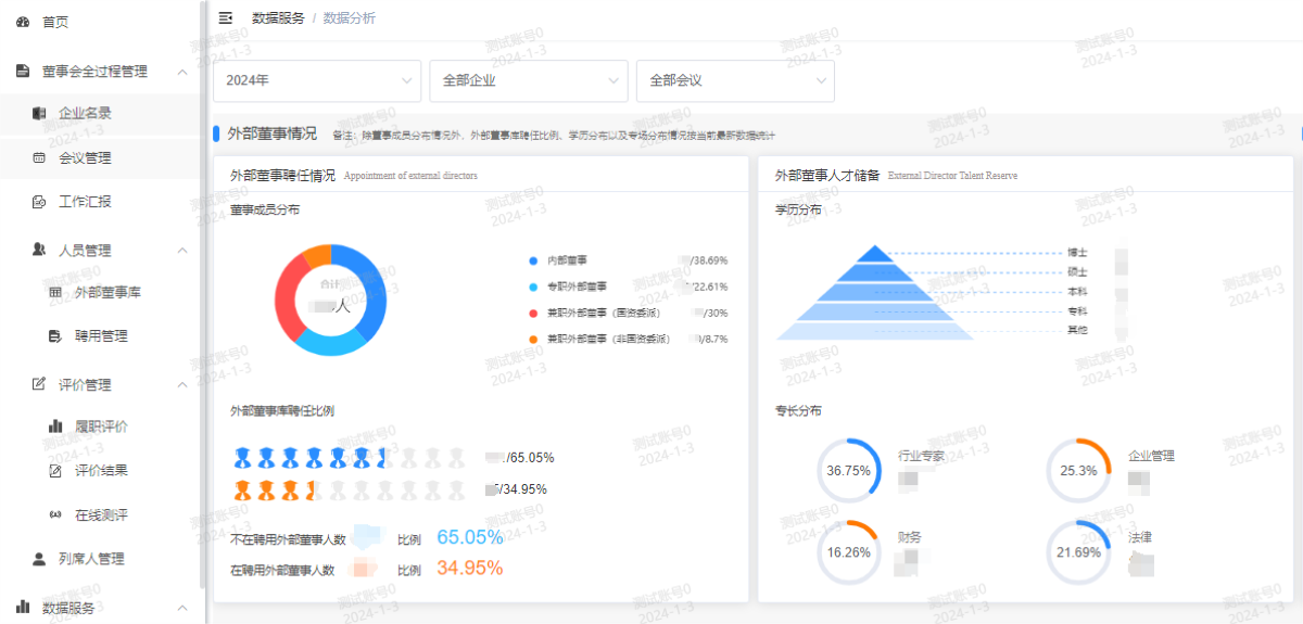 董事會運行管理系統按省國資委管理要求研發部署,依據國資監管機構要求與企業章程,結合企業發展戰略和業務特點,形成外部董事多維度畫像,深化預警提醒,前移監督關口,可視化呈現各企業董事會建設、外部董事人才儲備等情況,實現預警在先、監督有形,助力董事會規范性建設更高效、更智能。截至2023年底,董事會運行管理系統已覆蓋省國資委及16家省屬企業,累計錄入千余條會議數據與相關董事會議題數據,以及百余條外部董事履職數據,兼職外部董事庫中擁有百余位人才儲備。系統從使用便捷性、數據準確性和數據實用性三方面著手,打造“好用、實用、管用”的董事會運行管理數字化應用。