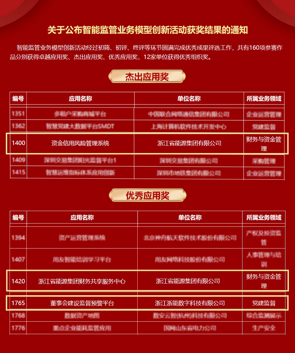 近日,國務院國資委2023年智能監管業務模型創新活動獲獎名單揭曉,浙能集團《資金信用風險管理系統》榮獲“杰出應用獎”,《財務共享服務中心》《董事會建設監督預警平臺》榮獲“優秀應用獎”。