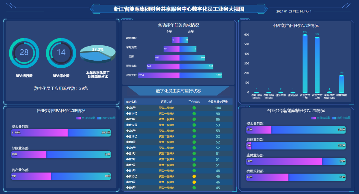 浙能財務共享運營平臺上線以來已推廣21批線上運行427家單位,開發129支標準化流程,與SAP等20個業財系統實現集成,覆蓋用戶3萬余人,從無到有打造以智能化、流程和數據驅動、業財稅資檔一體貫通、財務風險控制和財務人才培養為主,富有浙能特色、不斷迭代升級、賦能價值創造的財務共享金名片,走在浙江國資國企前列。在數智化方面,該平臺采用統一架構的端到端數字化平臺,利用IPA智能流程自動化、OCR智能審核、AI、NLP自然語言處理、全場景遠程辦公等先進技術手段,搭建起流程、審核、運營和數治四個方面組成的智能應用體系,實現憑證和支付自動化率雙雙超過99%,其中數字員工、數字化監督看板、智能語音提單、智能派單、智能客服等一批功能應用頗具特色、業內領先,榮獲上國會“2022年智能財務最佳實踐年度綜合大獎”。