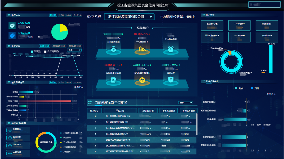 資金信用風險管理系統分兩部分,一是部署于省國資委財務風險監測平臺下的資金信用風險子系統,應用于省國資委及各省屬企業,旨在加強國資國企資金信用風險監測;二是部署于浙能集團的資金管理系統,旨在提升資金管理精細化、集約化及智能化水平,提高資金運營效率,防范資金風險。到目前,國資委側系統已完成17家省屬企業集團推廣,企業側系統已完成浙能集團約500家成員單位推廣。歷經多次版本更迭,系統功能不斷完善,已實現賬戶全生命周期閉環管理、融資業財一體化管理、債務風險預警、資金信用輸出風險監測、大屏智能化分析等功能,切實提升省屬國資國企資金信用風險管理水平。