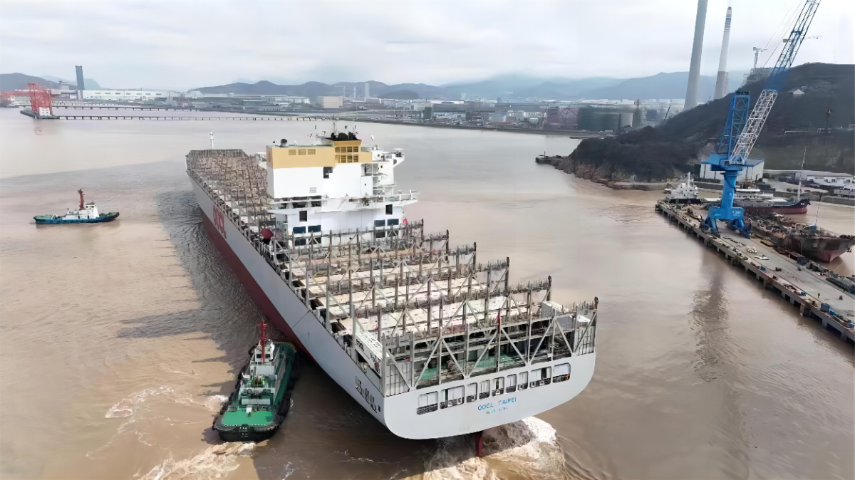 “OOCL TAIPEI”集裝箱船正緩緩駛離舟山華豐船廠白泉基地3號碼頭。 王暢 提供