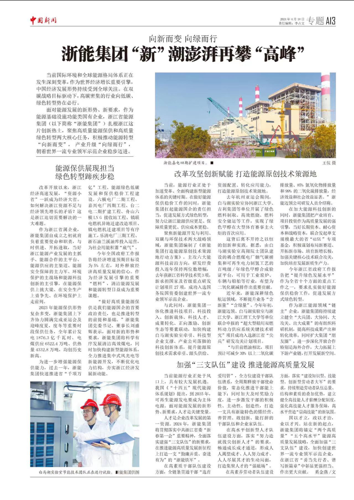 中國新聞網報道《浙能集團“新”潮澎湃再攀“高峰”》。 羅漪 提供