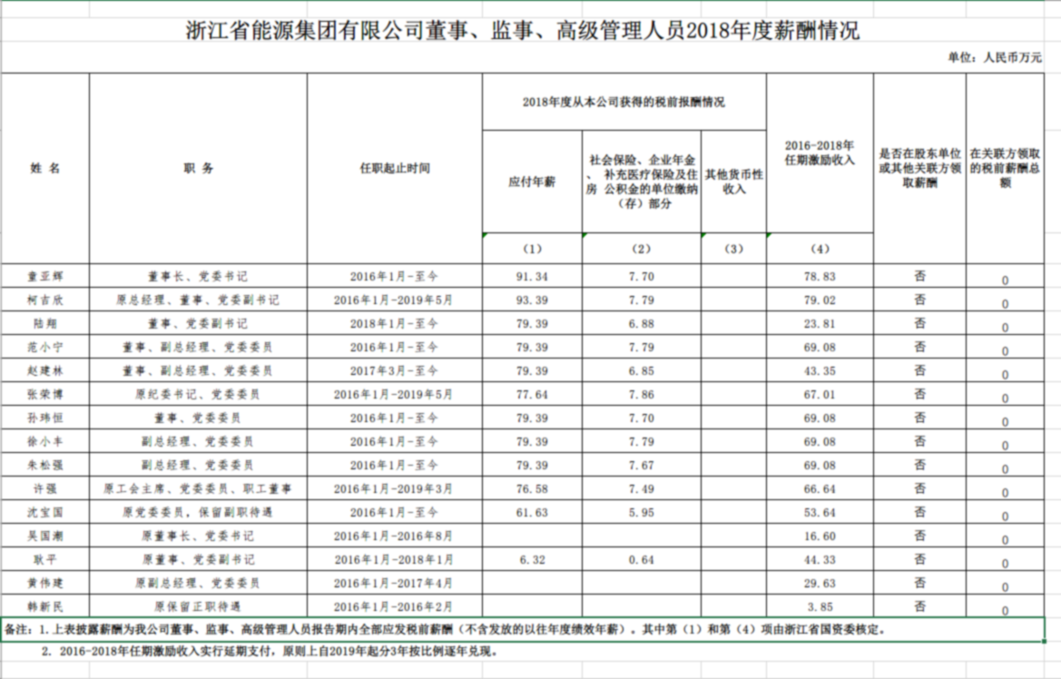 2018年度浙江省能源集團有限公司董事、監(jiān)事、高級管理人員薪酬情況